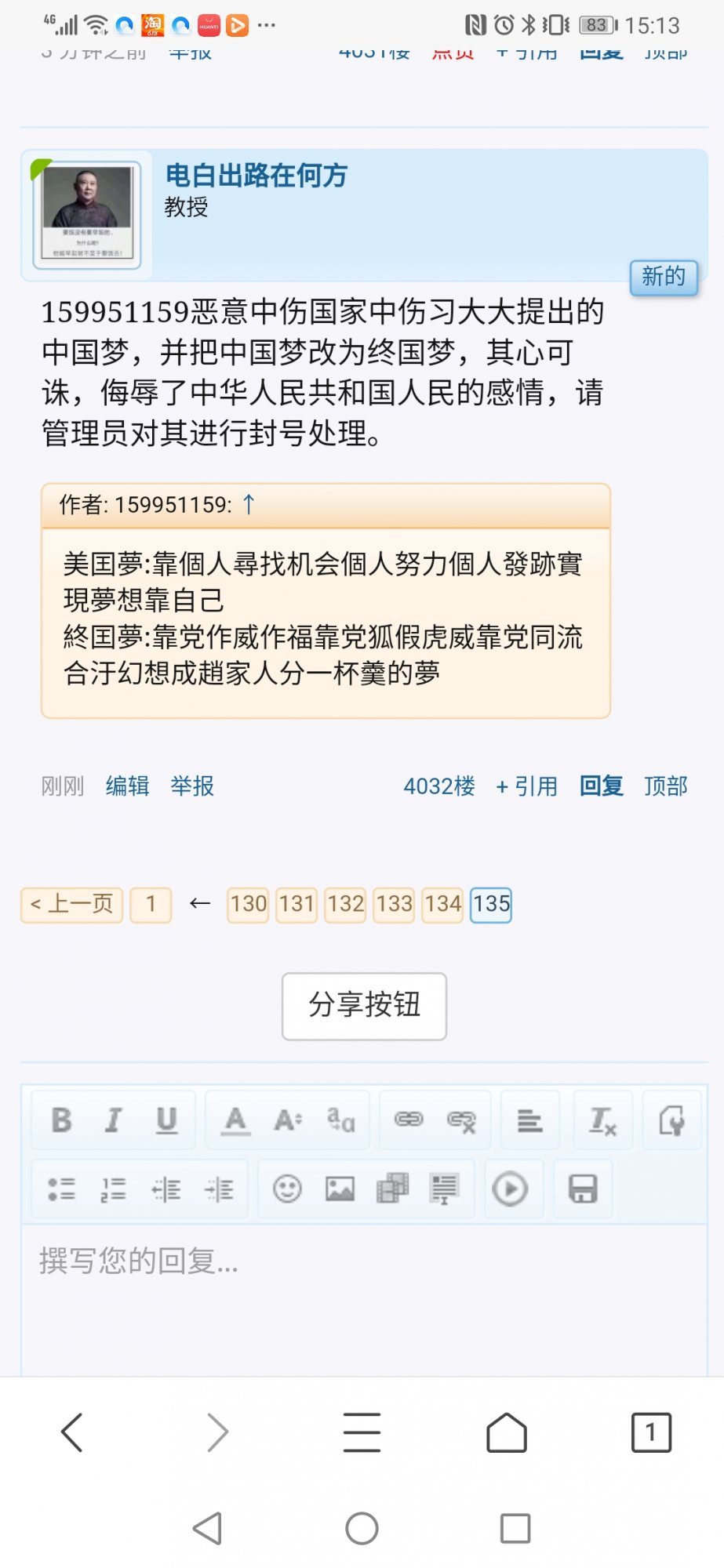 电白出路在何方 荣誉主席 注册 2010-07-01 消息 6,283 反馈评分 1,075 点数 191 2020-05-31 #1 159951159 说: 美囯夢:靠個人尋找机会個人努力個人發跡實現夢想靠自己 終囯夢:靠党作威作福靠党狐假虎威靠党同流合汙幻想成趙家人分一杯羹的夢 点击展开... 159951159恶意中伤国家中伤习大大提出的中国梦,并把中国梦改为终国梦,其心可诛,侮辱了中华人民共和国人民的感情,请管理员对其进行封号处理。此人已经让论坛陷入危险境地。