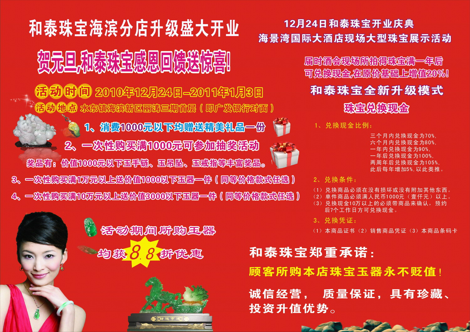 [attachmentid=251071]和泰珠宝全新升级,诚信经营,质量保证;凡在和泰珠宝购买珠宝玉器,均可“以珠宝兑换现金”,活动详情请查看附件图片。欢迎到本店选购…… 活动地点:水东镇海滨新区丽涛三期首层(即广发银行对面) 公司网站:www.hetaizb.com