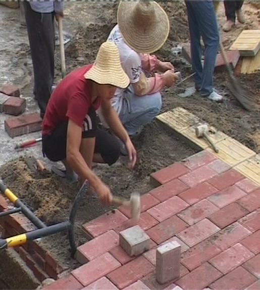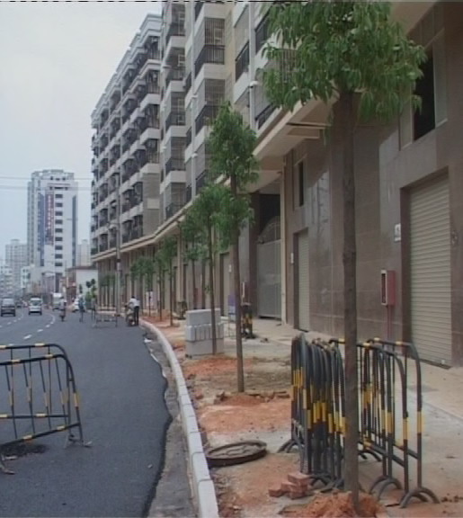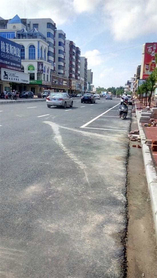小编在大全宾馆路段看到,这里可谓是最热闹的施工现场,施工人员正在铺设人行道,粉红色的地板砖格外引人注目,东西两面的人行道地板砖铺设工作同时进行。据施工人员说,这几天加紧施工,主要是铺设人行道,从三角圩向水东加油站方向已铺设东西面各300米。