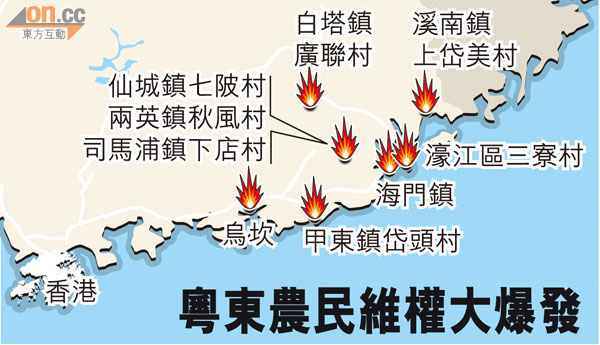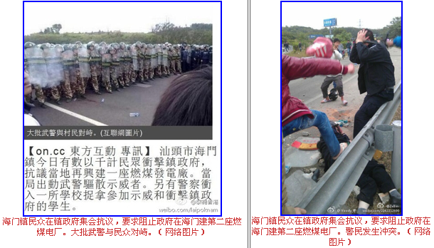 12月20日上午11时,广东汕头市海门镇民众在镇政府集会抗议,要求阻止政府在海门建第二座燃煤电厂。由于当地政府采取回避的态度,更激发了民众的愤怒,他们冲上镇政府二楼,二楼大平台也被占领。下午民众到深汕高速堵路,到记者截稿时,武警已经开始出手镇压。有民众在新浪微博披露,已有两名16岁中学生被武警打死。
