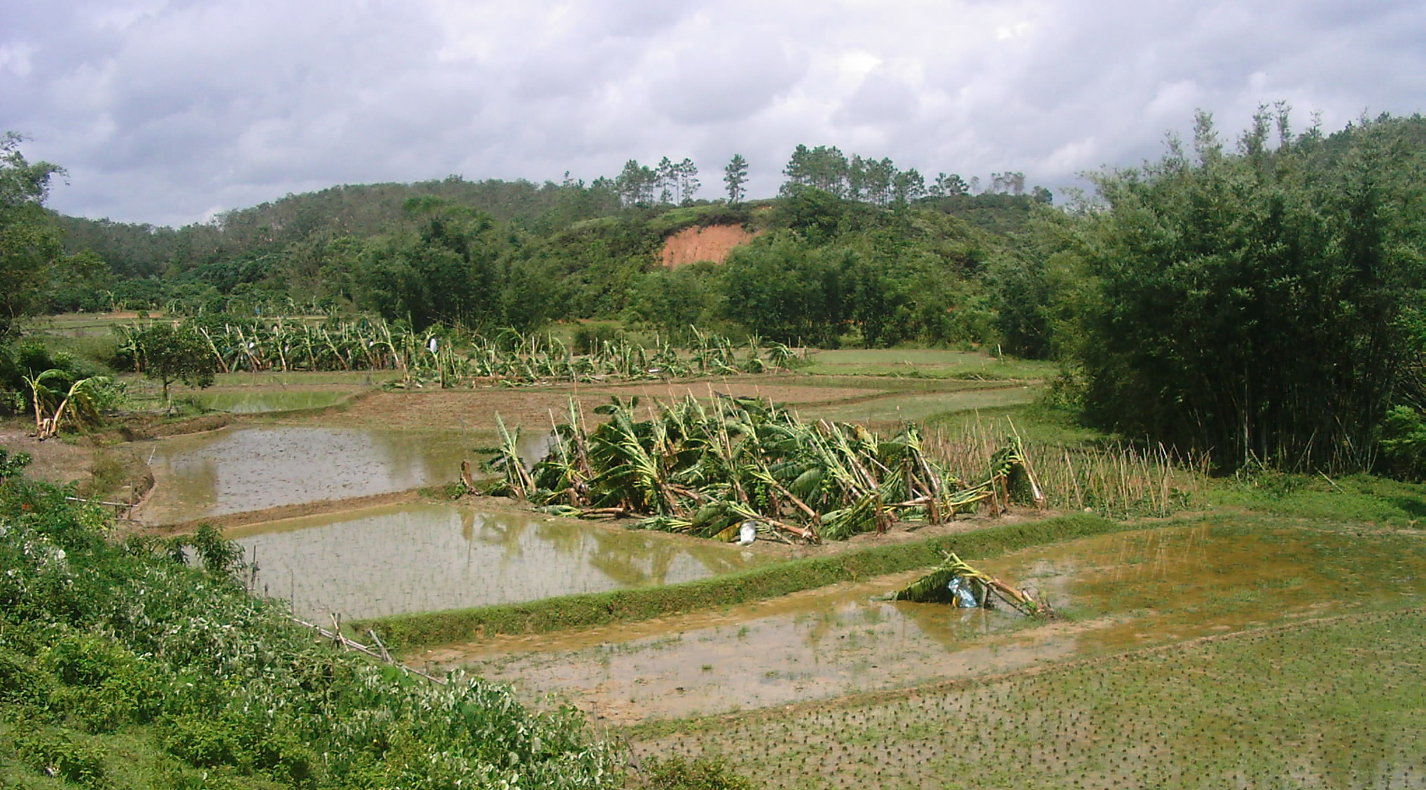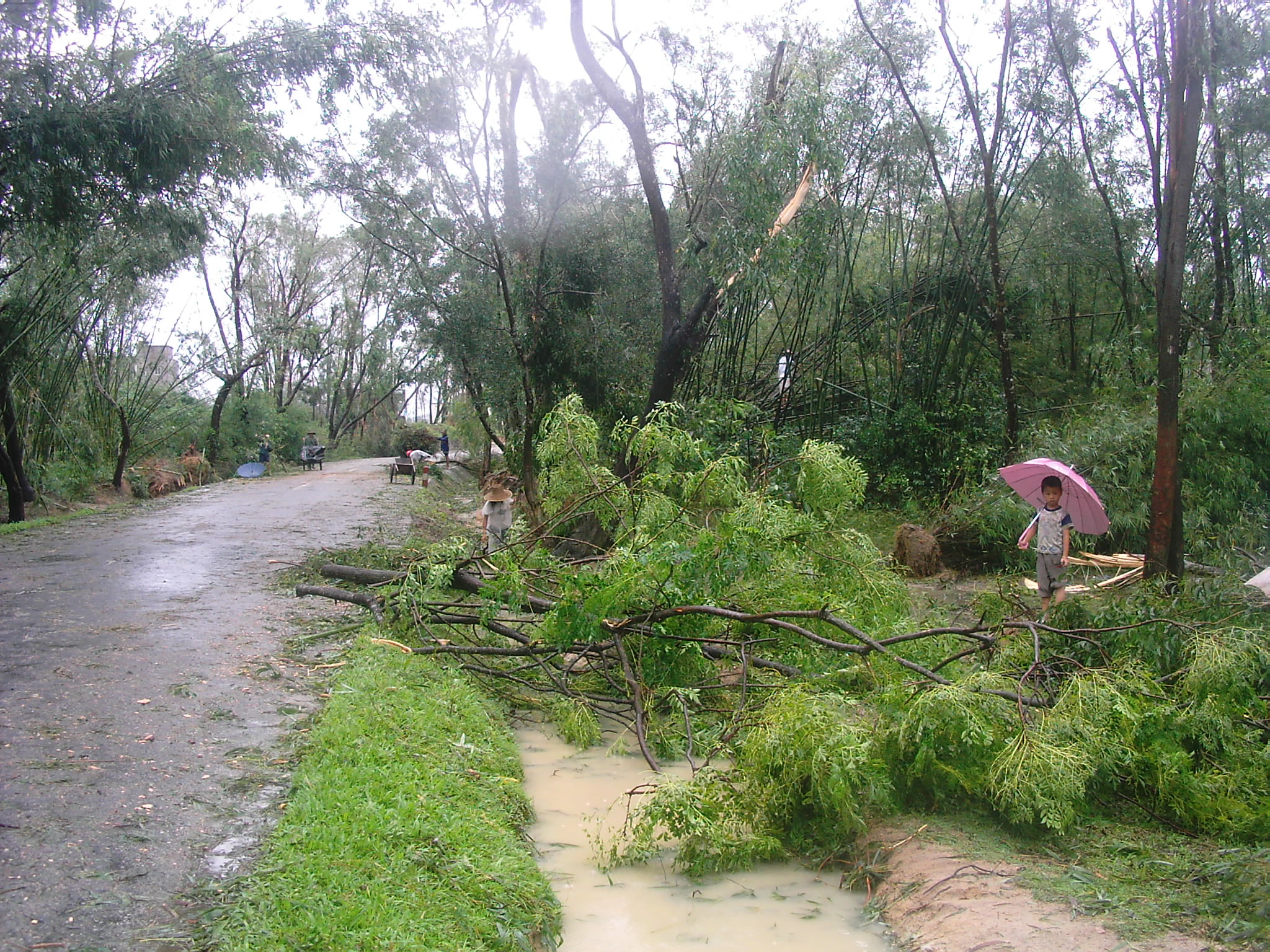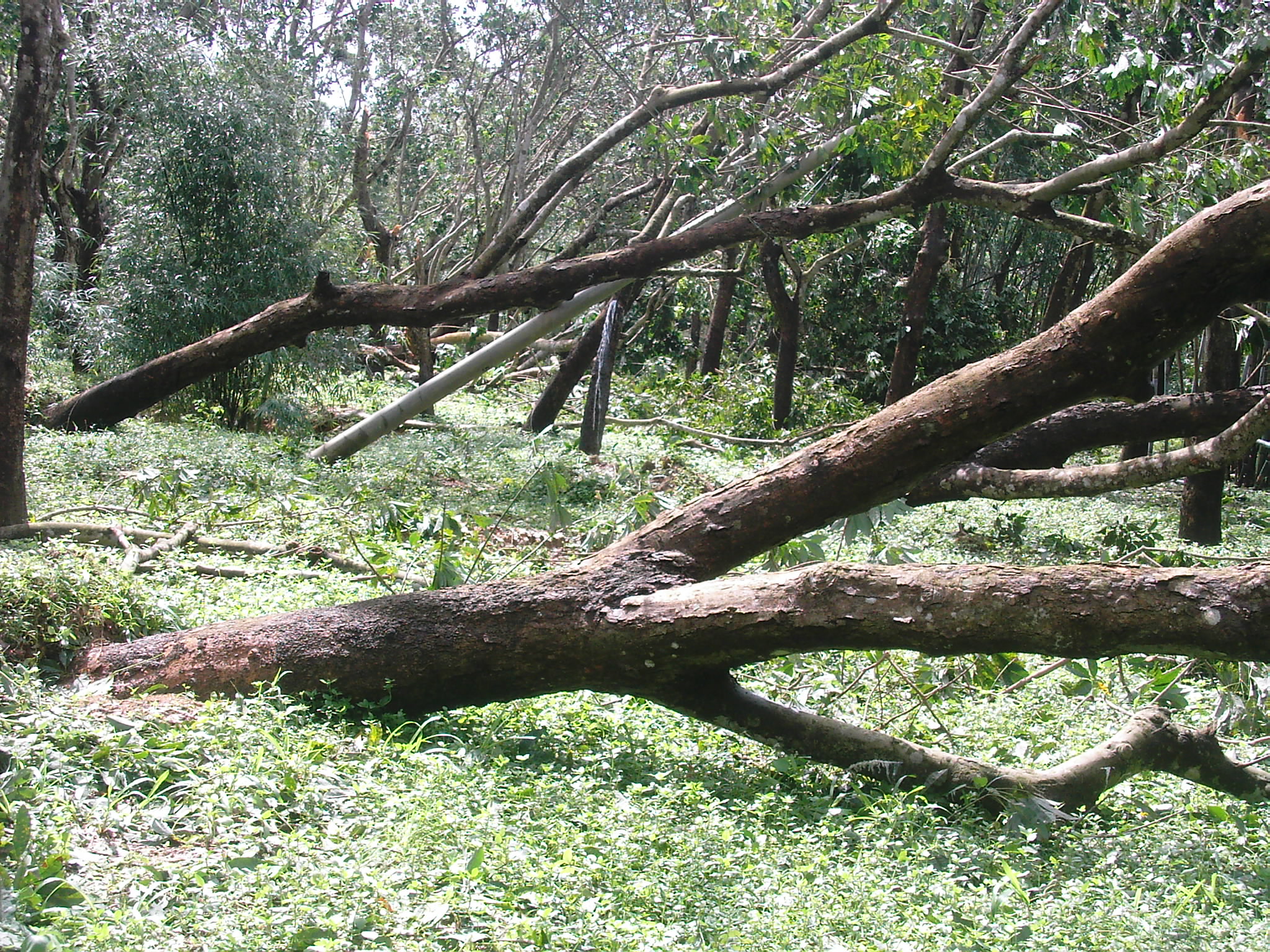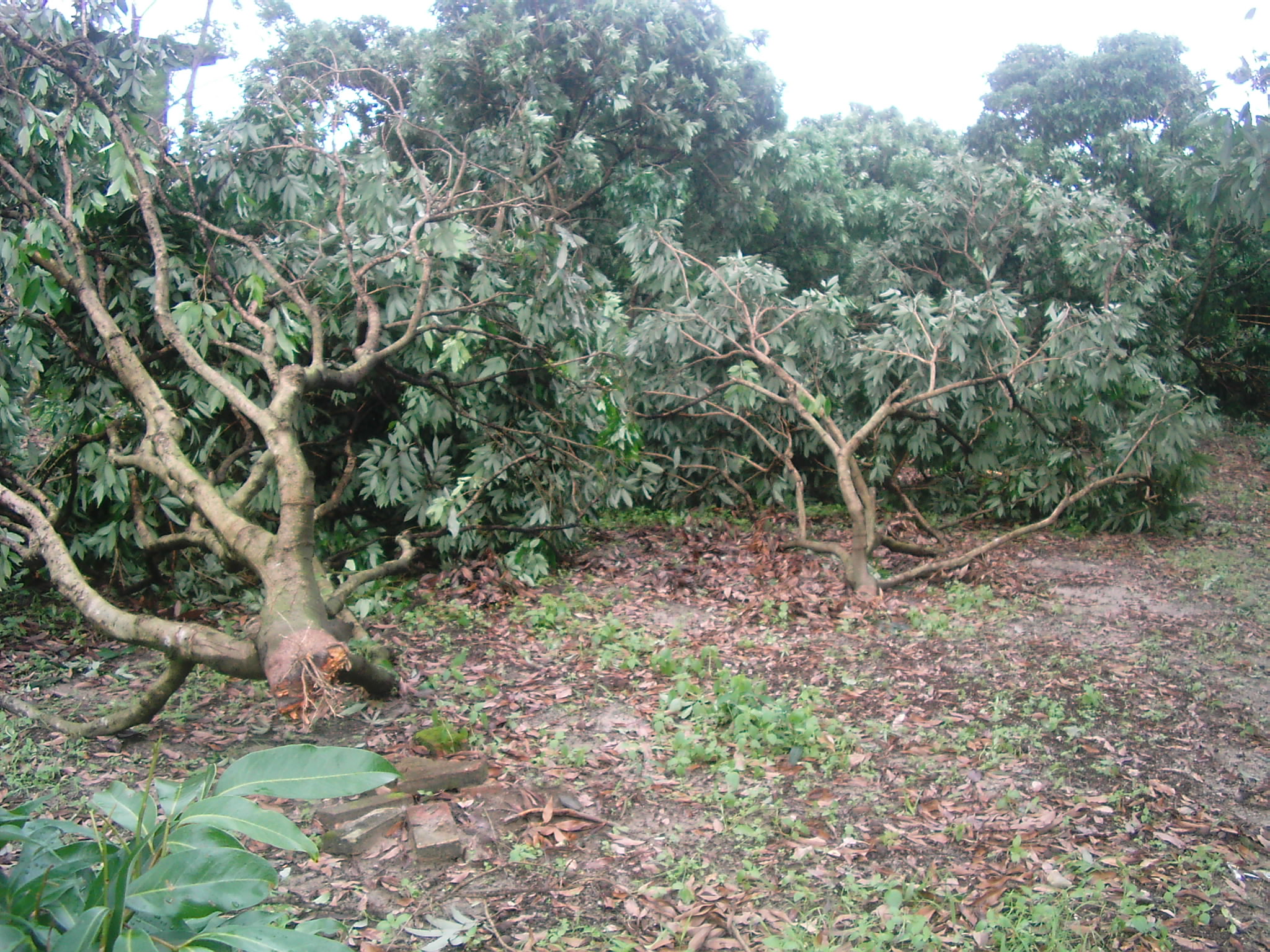 前日去了趟沙琅。车至观珠后,公路两旁的树木被风吹得七零八落,部份栏腰折断,部份连根拔起,特别奇怪的是沙琅曙光农场入口的一片橡胶林(大约七八十亩),其中的80%都被拦腰折断,折断端好象被什么拧断似的,几乎断端的位置处于同一水平,整个受灾面类似圆形状,但是相距二三百米的荔枝林却安好如初。我们分折:一是橡胶树较嫩,而荔枝木就较硬,抗风强。其次,从受损形态来看,此处应受到旋转状风(如龙卷风)的影响,且这风力特大。