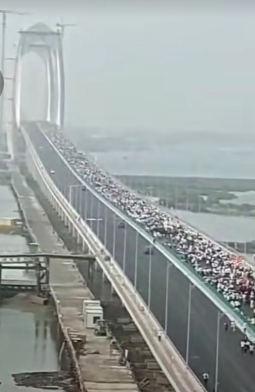 我早上将近七点钟就到了,我想看下有多少人参与,与看下人景,特别水东湾大桥上的人景,从起点一直走到可看见水东湾大桥上坡的位置,一眼望去已都是人影,而那个启动仪式好像是8点十几分才开始?为了一睹已占先偷步的水东湾大桥上的人景,我也没有看启动仪式,经过那启动仪式平台时,只看到还在演练
