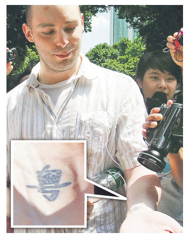 加拿大籍留W生向人展示其手腕上的「」字y身
