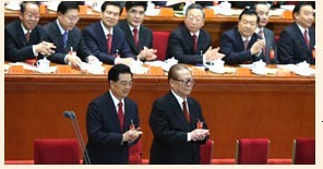 8点57分,人民大会堂会场内。台下,各路代表们已有序入坐。台上,除了第一排最高领导人席位外,所有主席台成员都各就其位。 “迎宾曲”突然响起,这是重大场合中国最高领导人出场的前奏。舞台左侧的背后,慢慢走出了现任ZG总书记胡锦涛。紧随其后的是10年前卸任的总书记江泽民。两任总书记在过道上与第二排的主席团成员握手,打招呼。