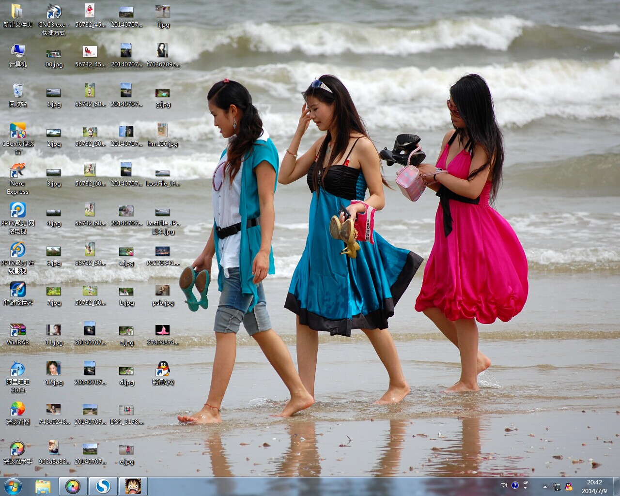 兄弟拍得这幅图片,色彩分配美极(蓝绿红全,尤其是后面拖动的那条红色裙子,点缀作用非凡),而且上传了原图片,故收藏并做了桌面。效果很好。 P:这几位美女长得不错呗,中间那位可真美了,有肉有色有相,是我最喜欢的类型。 海边美景图片做桌面的好处是--满足欣赏美女的欲望的同时,对于炎炎夏日,有一种去燥剂的作用。