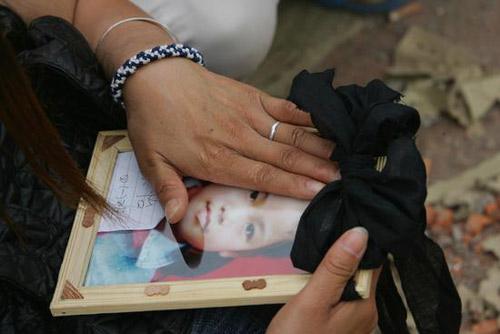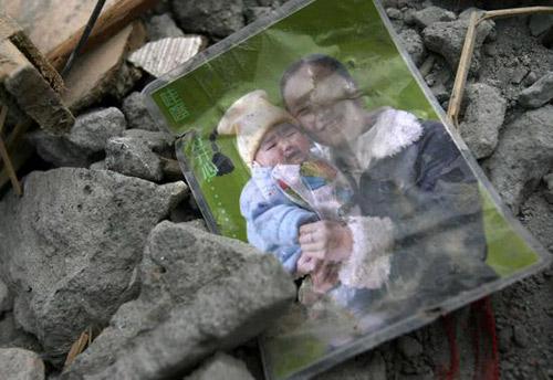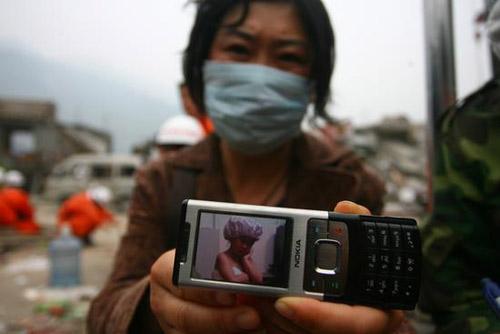 5月18日,汶川映秀救援现场,汶川映秀镇幼儿园的孩子妈妈拿着5岁孩子的最后照片。