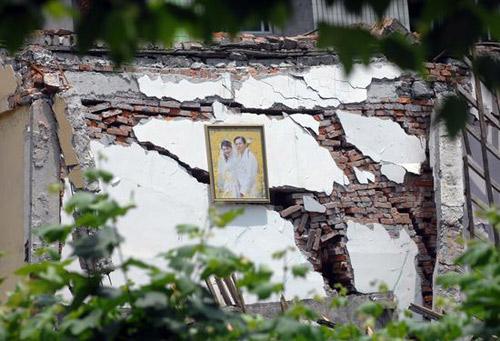 5月19日,哀悼日第一天,北川一处废墟上还挂着结婚照,7天前地震毁灭了这个幸福的家庭。