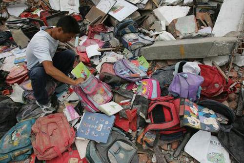 5月20日,四川绵竹,遇难孩子的书包散落一地。