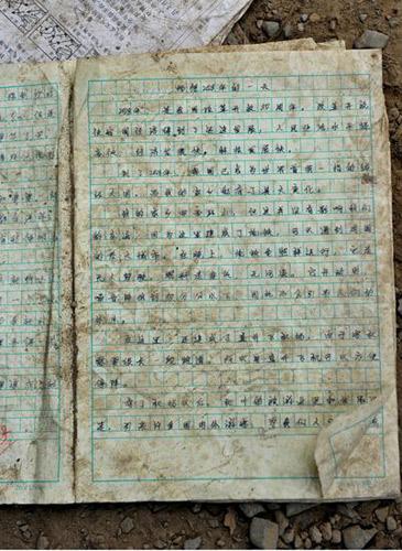 5月17日,北川中学搜救现场,学生们留下的作文《畅想2008年的一天》,孩子们的梦想都在上面。