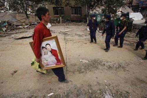 5月16日,北川县城里,一名男子拿着从废墟中扒出的结婚照走出县城。