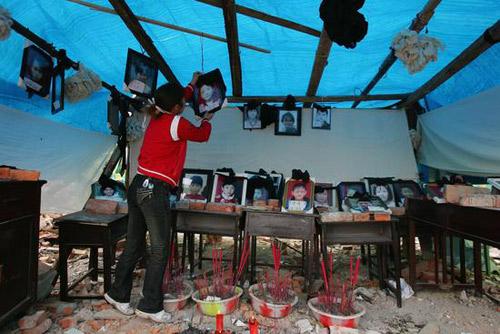 5月20日,四川绵竹,一名母亲在挂遇难女儿的照片。